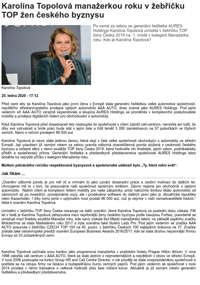 Jihoceskenovinky.cz: Karolína Topolová manažerkou roku v žebříčku TOP žen českého byznysu